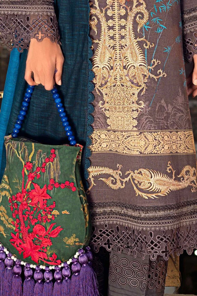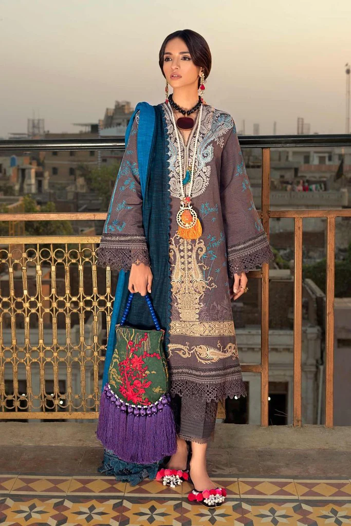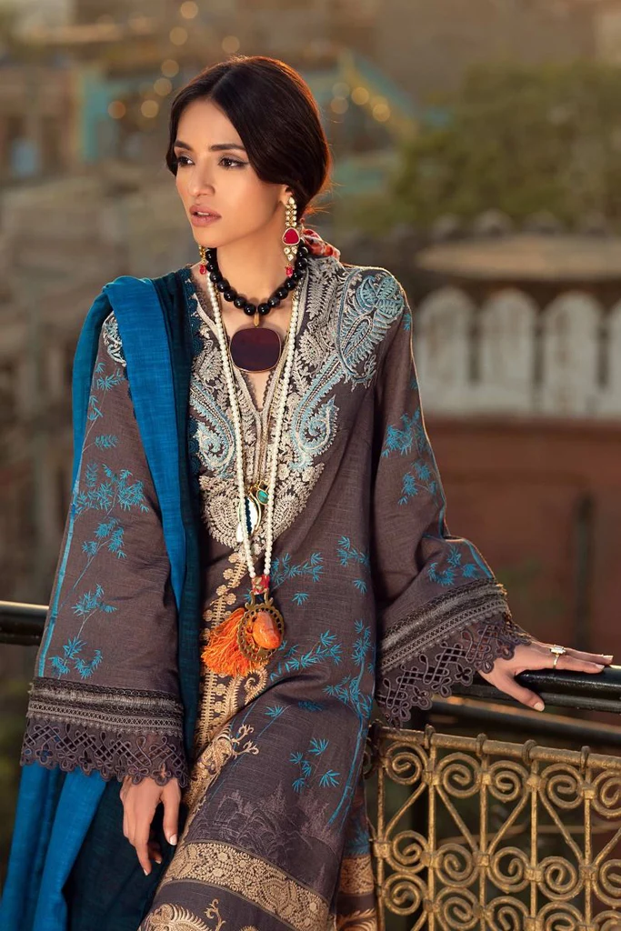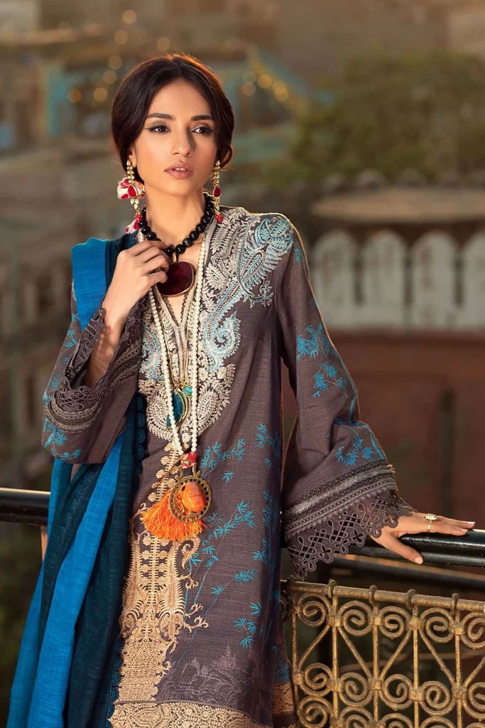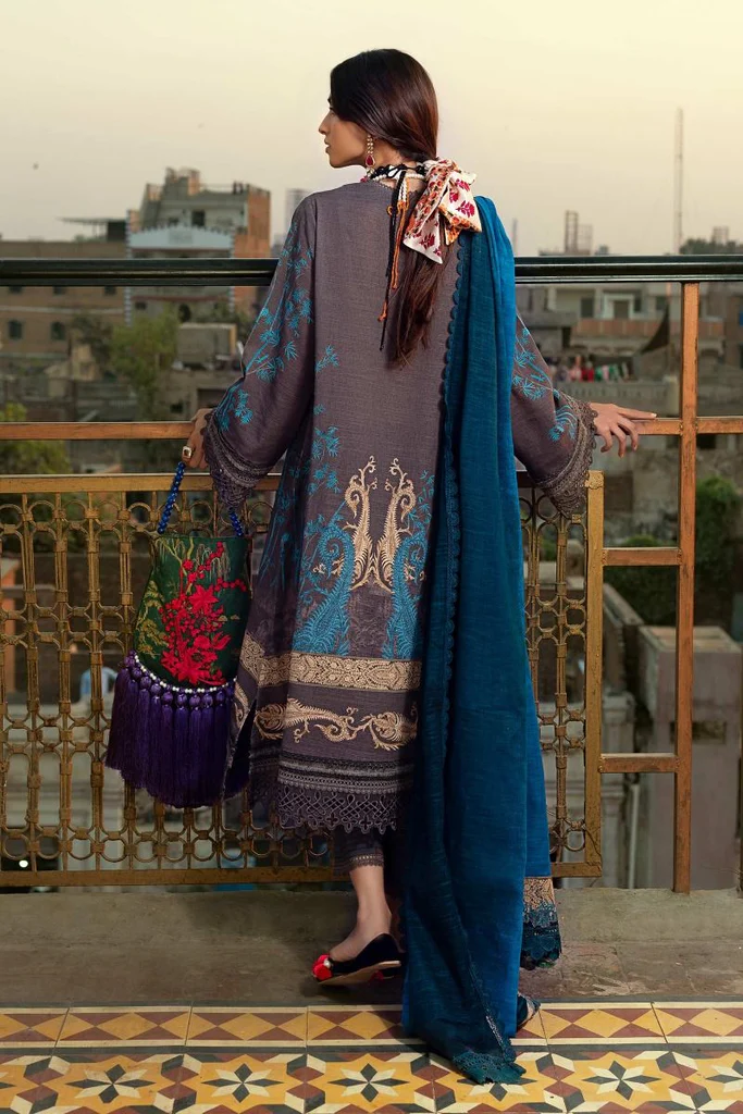 | Fabric: A shadow grey, marlin blue, sand and oat slub shirt is layered with a fusion print of Chinese trellis and Kashmiri kashida kari inspired motifs. The sequined neckline rests elegantly onto an oat and marlin blue organza base. Cotton pants in shadow grey complement the khaddar dupatta, dip dyed to perfection in shades of marlin blue. Digitally Printed Shirt Front On Slub 1.20 meters Digitally Printed Shirt Back On Slub 1.20 meters Digitally Printed Sleeves On Slub 0.65 meter Embroidery On Organza Printed Dupatta On Khaddar 2.5 meters Dyed Pants 2.5 meters |