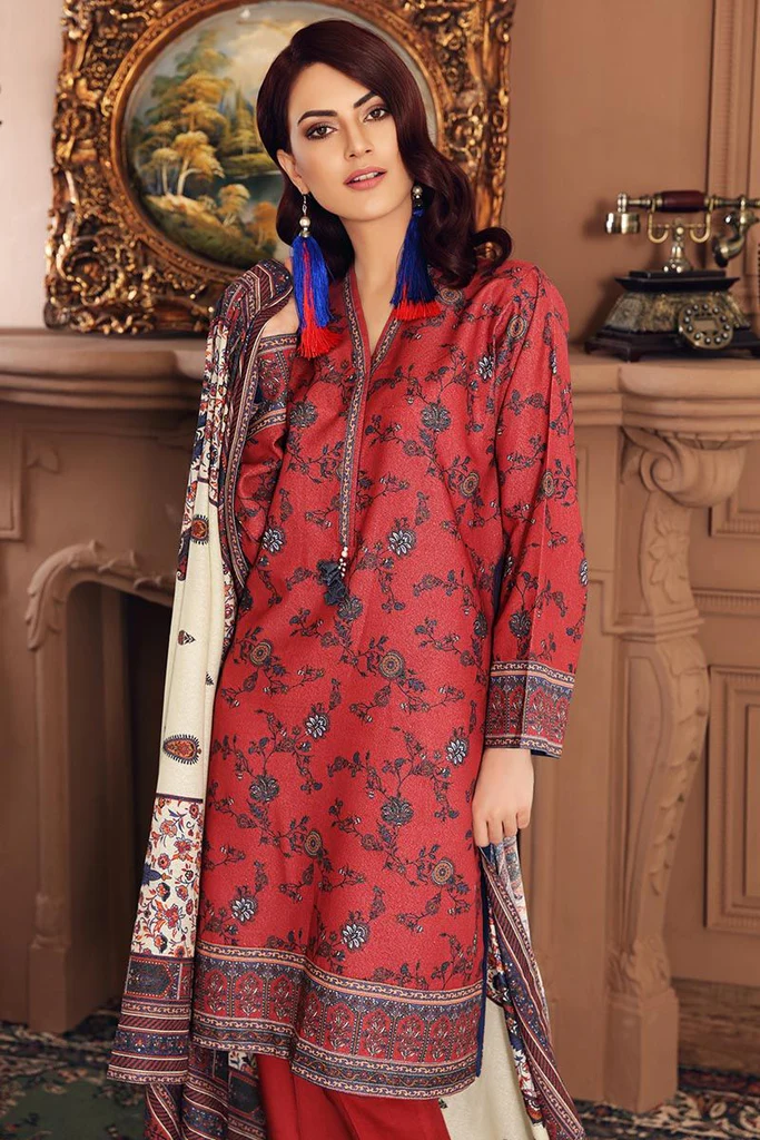 | Fabric: Digital Printed Karandi Dupatta – 2.5 meters Digital Printed Karandi Shirt – 3 meters Dyed Linen Trouser – 2.5 meters |