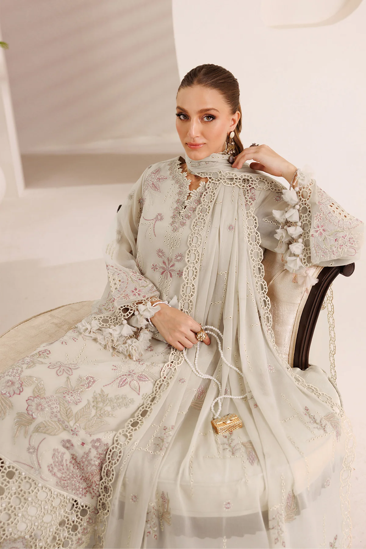 A dusty-hued ensemble with contrasting tonal floral embroidery adorns the chiffon shirt, with beautifully composed motifs brought to life through delicate foil work that adds a soft, shimmering touch. Paired with an intricately embroidered chiffon dupatta and classic raw silk trousers, this look is a graceful blend of texture and tradition.