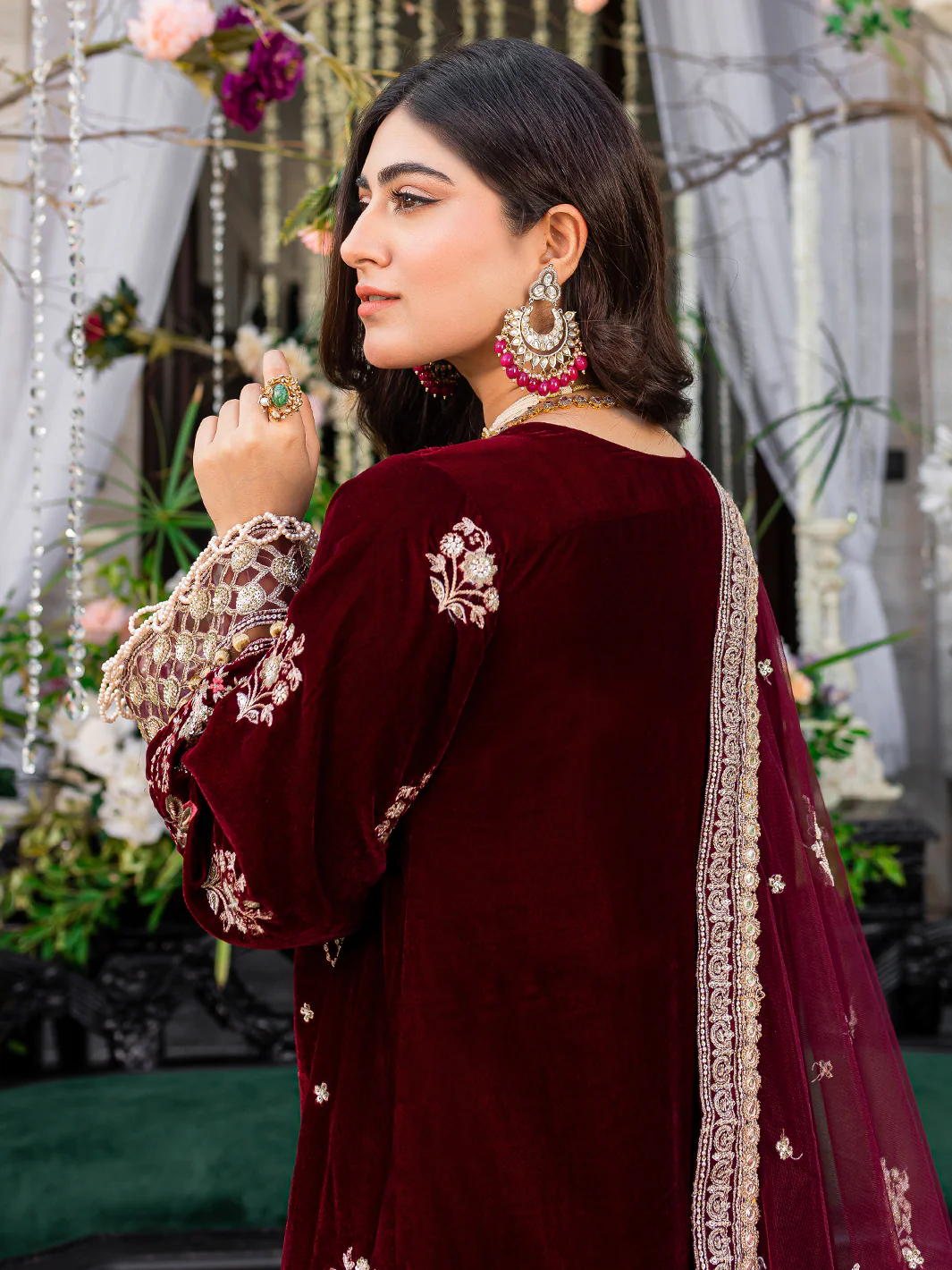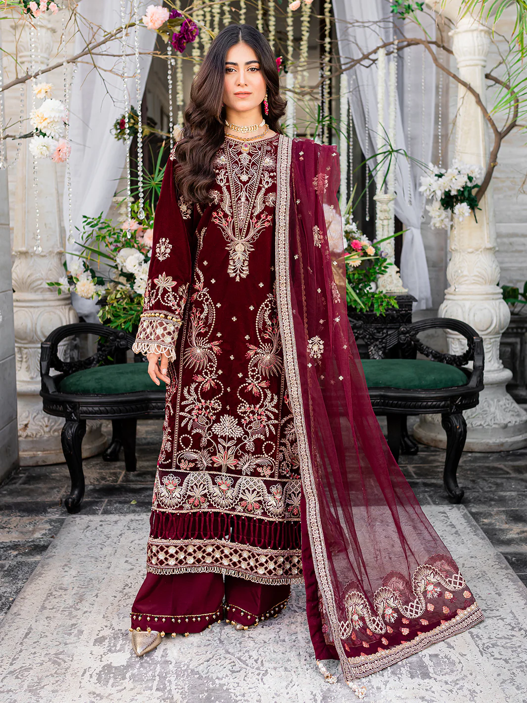 Elegance meets opulence with 'Afreen' from Heeriye by Izel Apparel. This maroon beauty is the epitome of luxury, with its embroidered velvet front, embroidered left and right panels and captivating details. Velvet sleeves and organza accents add grace to your attire, while the plain velvet back creates a stunning contrast. With an embroidered net dupatta and dreamy organza pallus, it's your go-to for special occasions. Complete the look with a comfy raw silk trouser. Elevate your style with the timeless allure of 'Afreen'!