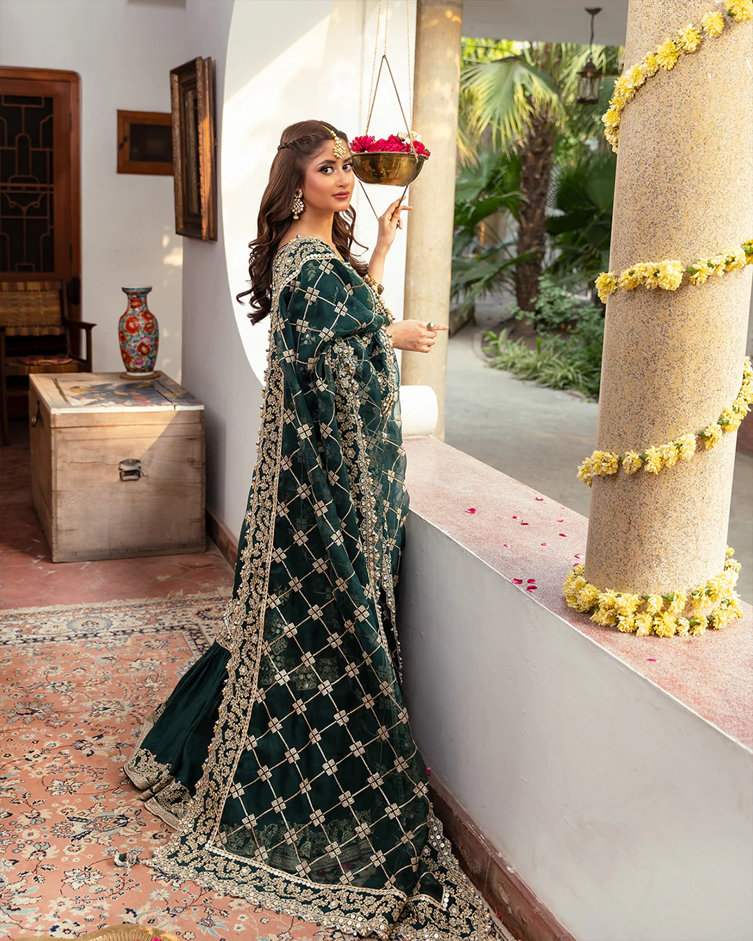 Ahin reflects the dynamic versatility of refined craftsmanship and unparalleled quality. The statement gharara set is attentively detailed by hand with tilla and sequins interspersed intricately across the Korean Raw silk shirt and gharara. The majestic emerald green ensemble is complemented by the embroidered organza dupatta, elevating the look to perfection.