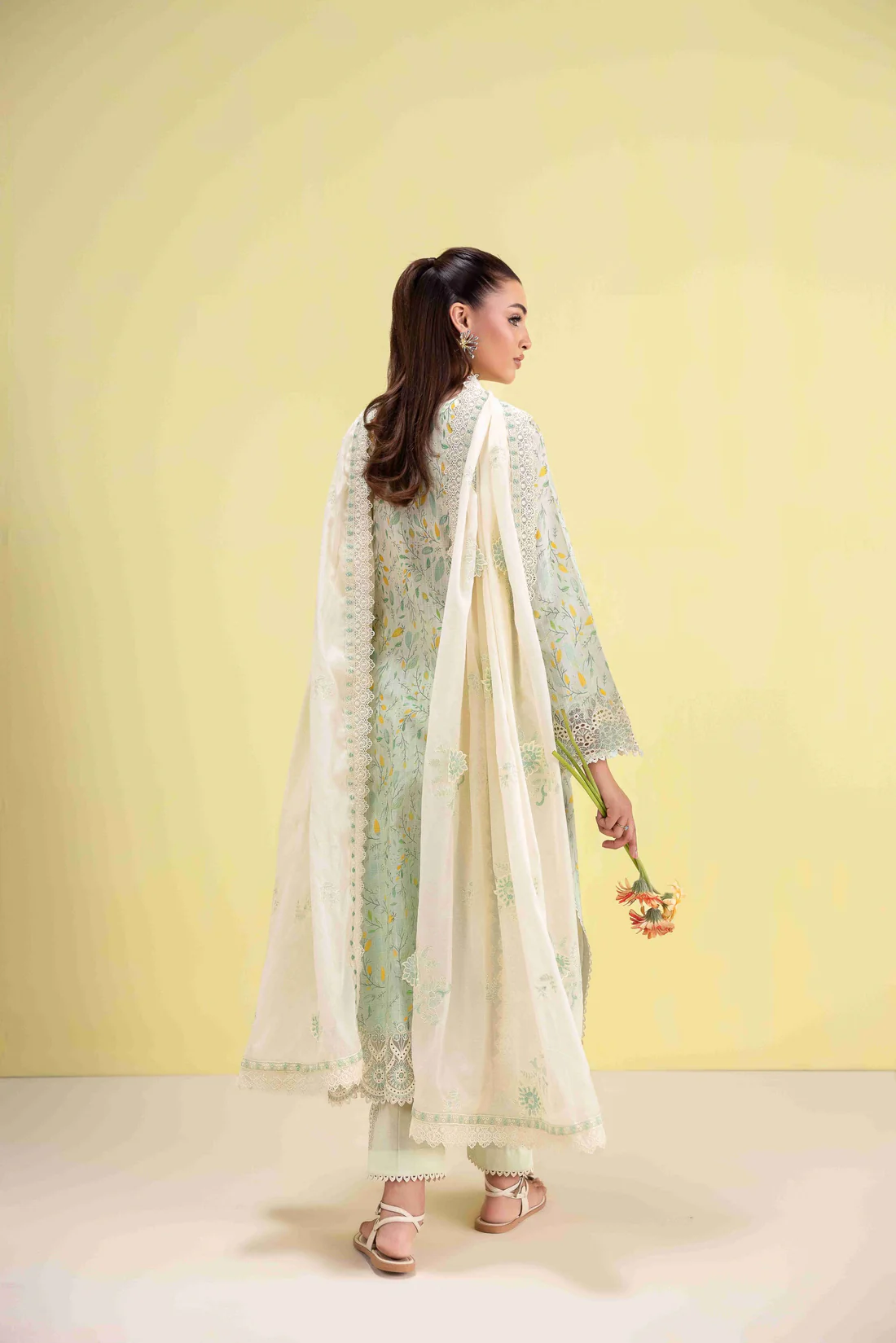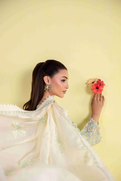 Rendered in a refreshing powder mint tone, this look features delicate tone-on-tone embroidery that enhances its subtle charm. Crafted from airy dobby lawn, it pairs seamlessly with a cotton trouser and a cotton silk dupatta adorned with graceful 3D embroidery an elegant pick for the season.