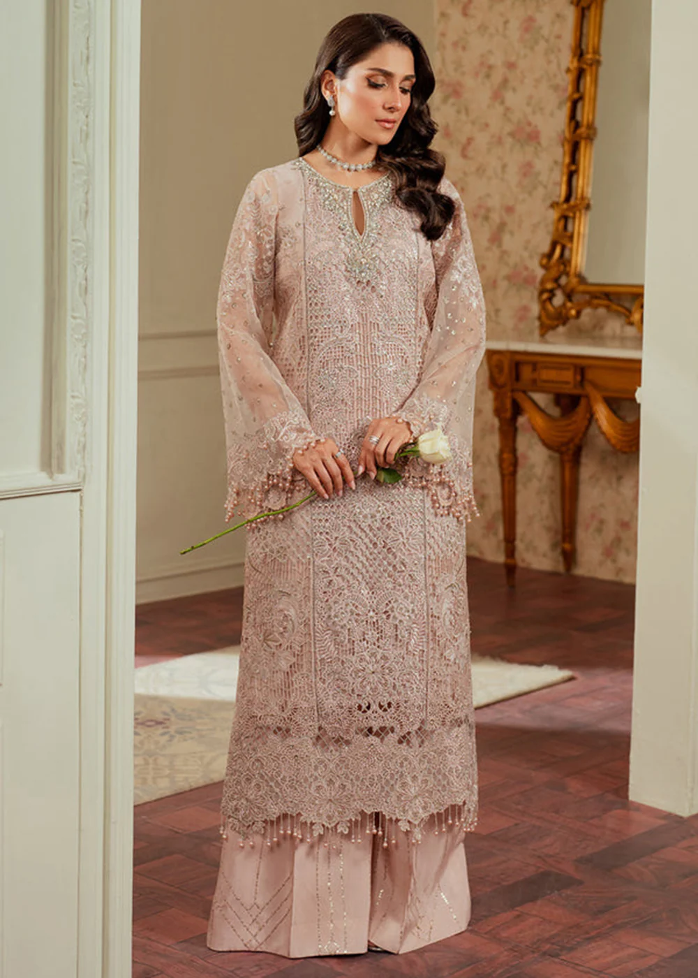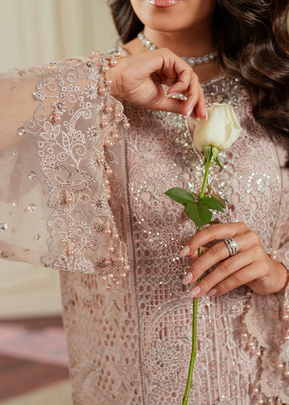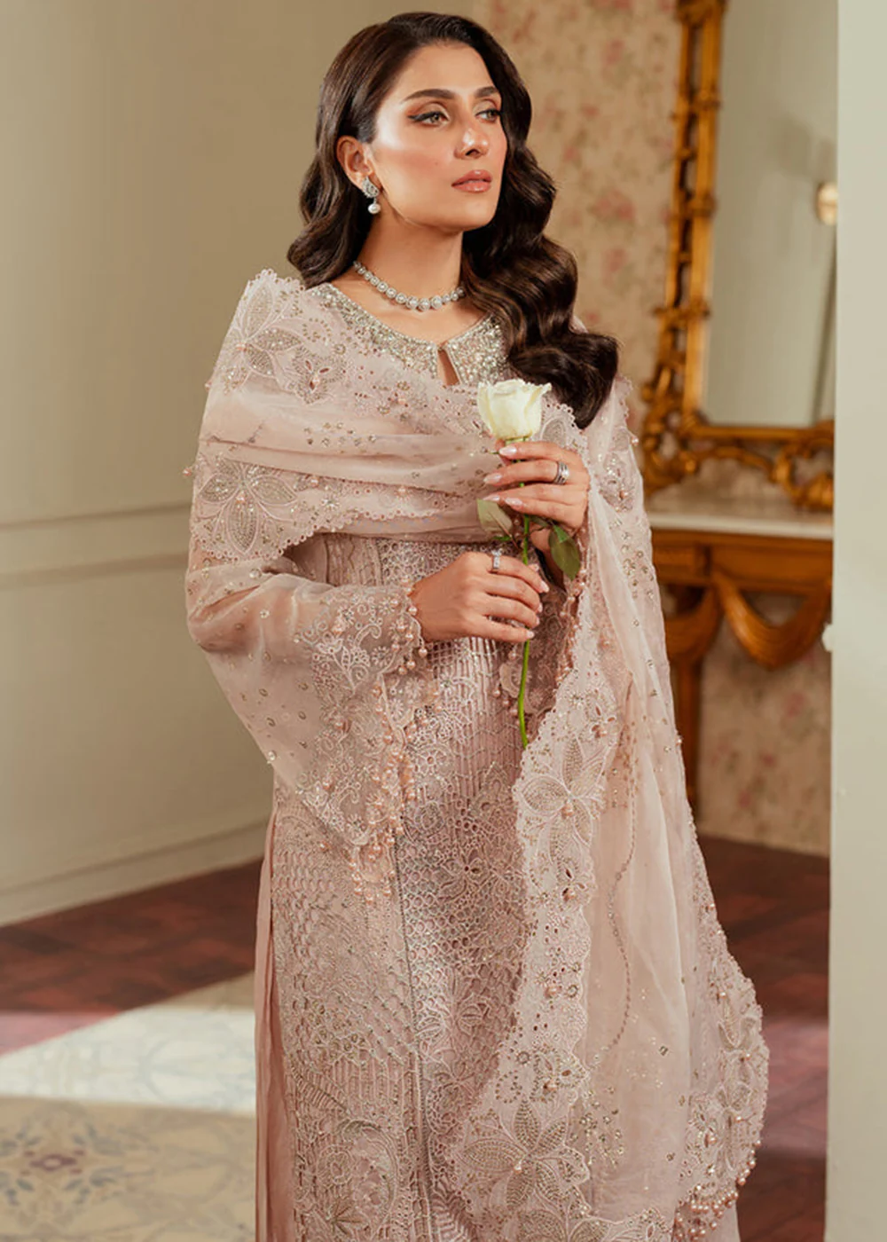 This outfit look is elevated by an organza dupatta, ripe for enhancement with pink-on-pink motifs, silver tilla, and sequins. The base is dyed silk, offering a sleek, smooth silhouette that complements the elaborate upper designs. Add sequin detailing patterns for an understated shimmer that resonates with bespoke luxury.