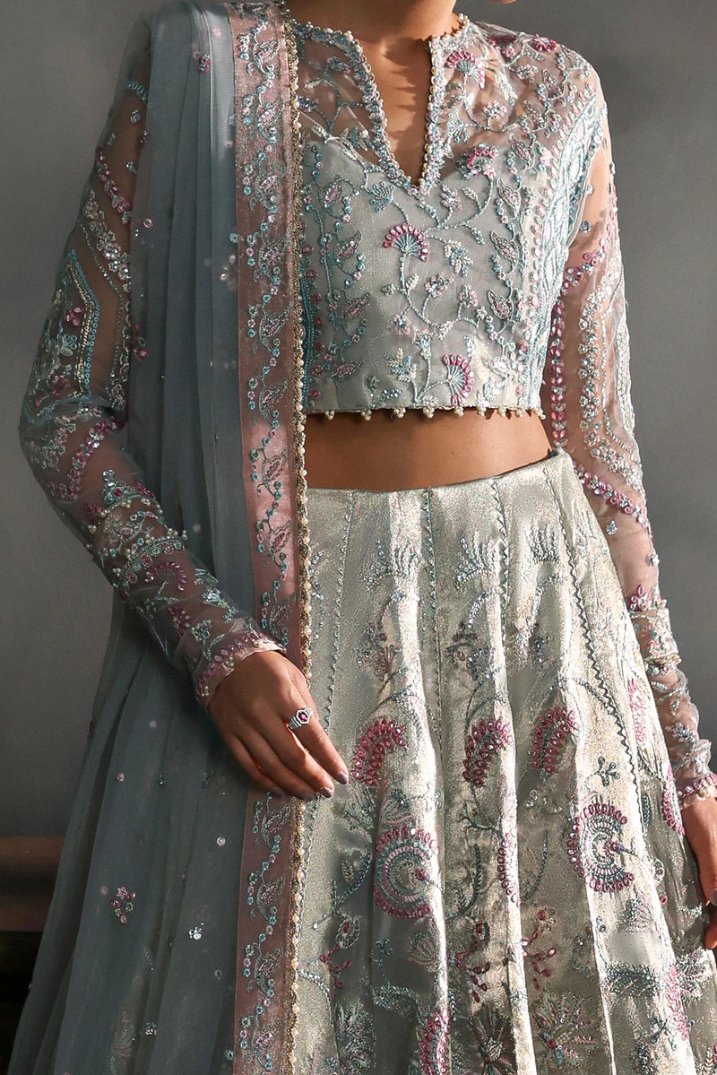 EMBROIDERED FRONT+BACK PANELS 12 PCS AQUA ZARI TISSUE