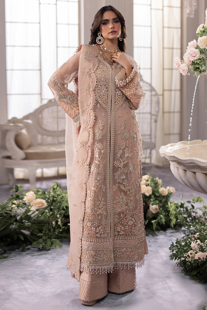 Drenched in the tranquil elegance of pastel tea pink hues, 'Elysia' manifests as a vision of ethereal beauty. Its delicate tulle canvas is adorned with glistening tilla embroidery and intricately woven threads in shades of sage, ivory, and periwinkle, complemented by lustrous pearls and sequin accents, with delightful touches of silver and gold. Harmoniously paired with tonal trousers and a resplendent dupatta, adorned with a meticulously embroidered border, this design exudes feminine charm and playful allure, making it the perfect choice for sophisticated daytime celebrations.