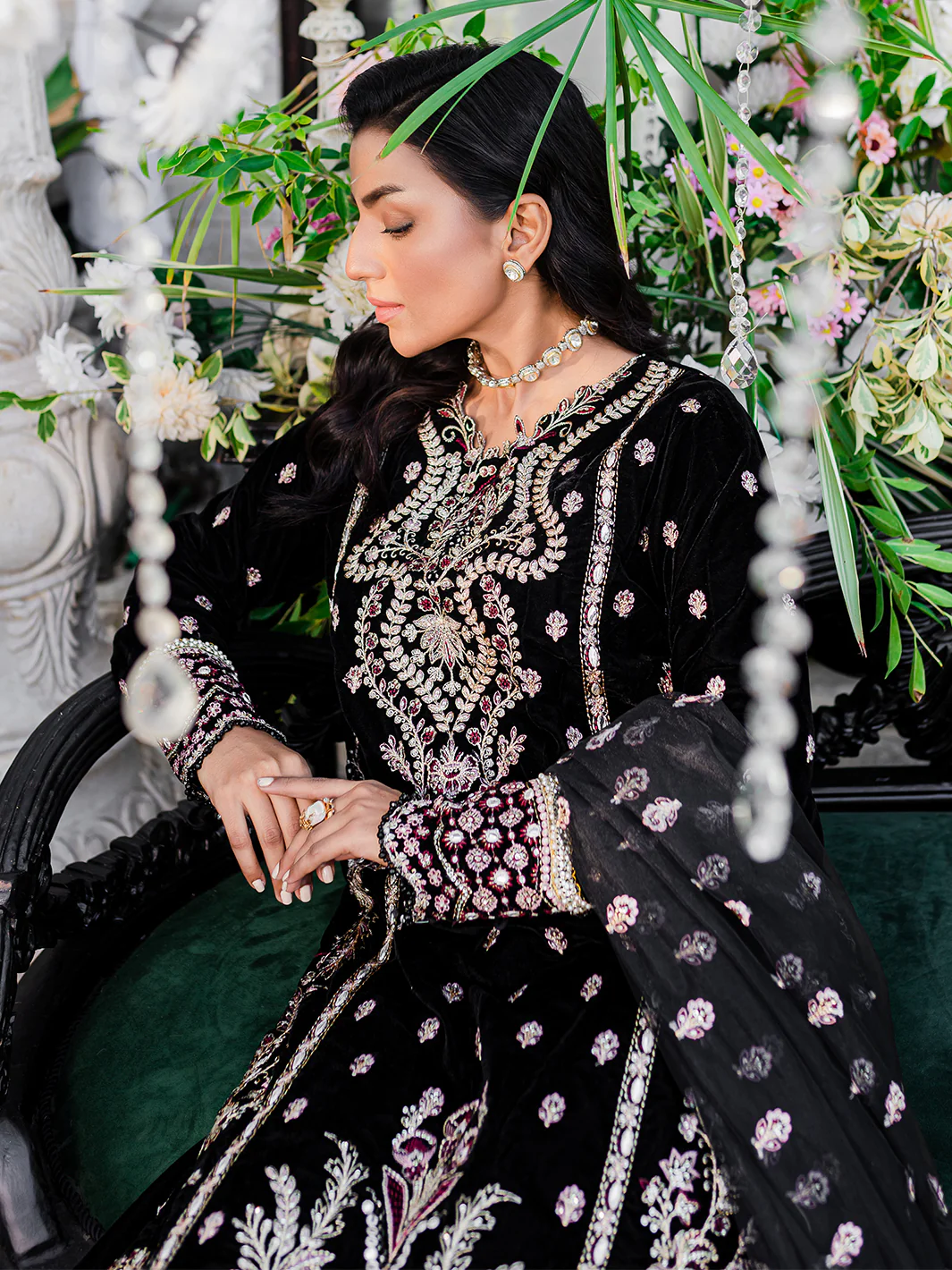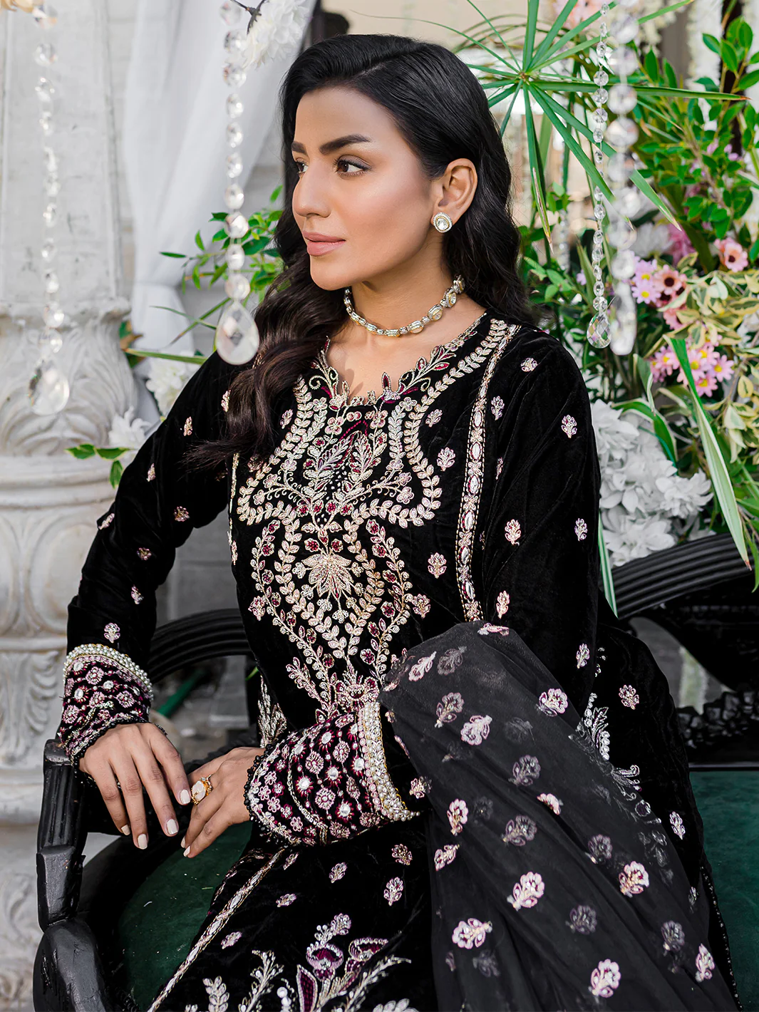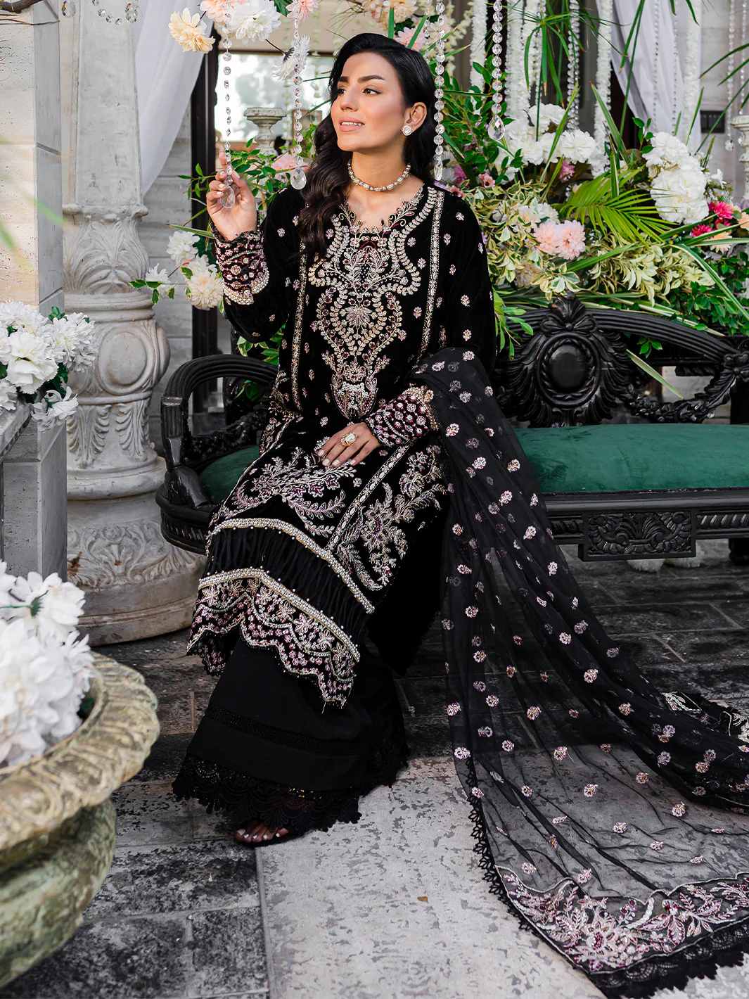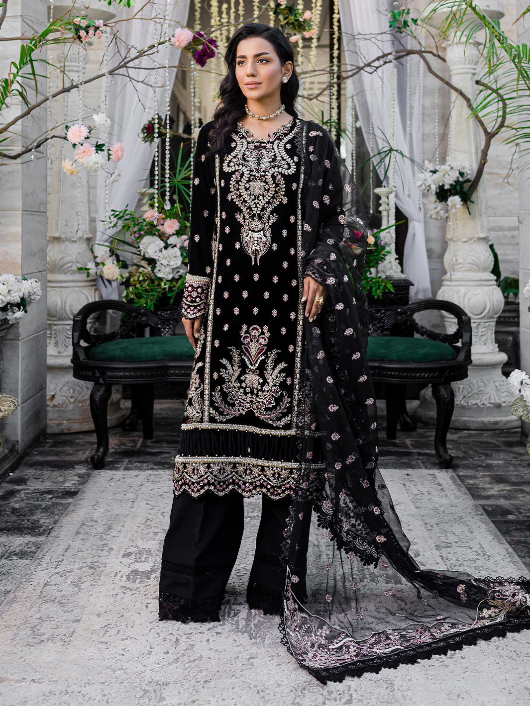 Introducing a timeless classic from the Heeriye Festive Unstitched Collection by Izel Apparel, the "Gayso" dress is a celebration of sheer opulence. The dress, drenched in a rich black hue, features an intricately embroidered velvet front that exudes luxurious charm. The plush velvet hem patch and sleeves add an air of elegance. In contrast, the plain dyed velvet back creates a captivating visual impact, making it a truly enchanting piece. Accompanied by an embroidered net dupatta and two organza pallus, this dress drapes with poise and grandeur. The ensemble is completed with a matching raw silk trouser, ensuring both comfort and style. The "Gayso" dress is a statement of timeless allure, the epitome of luxury and style, perfect for making a lasting impression at any special occasion.