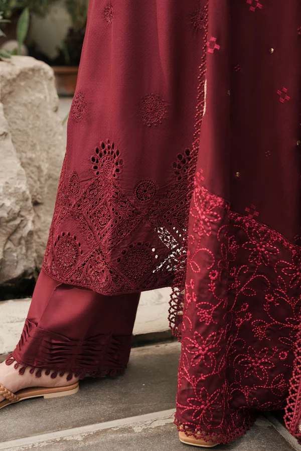 This red outfit features exquisite multi-head embroideries, balanced with delicate lace cutwork inserted in the hem and sleeves.