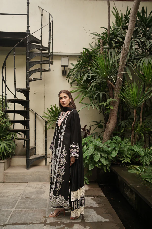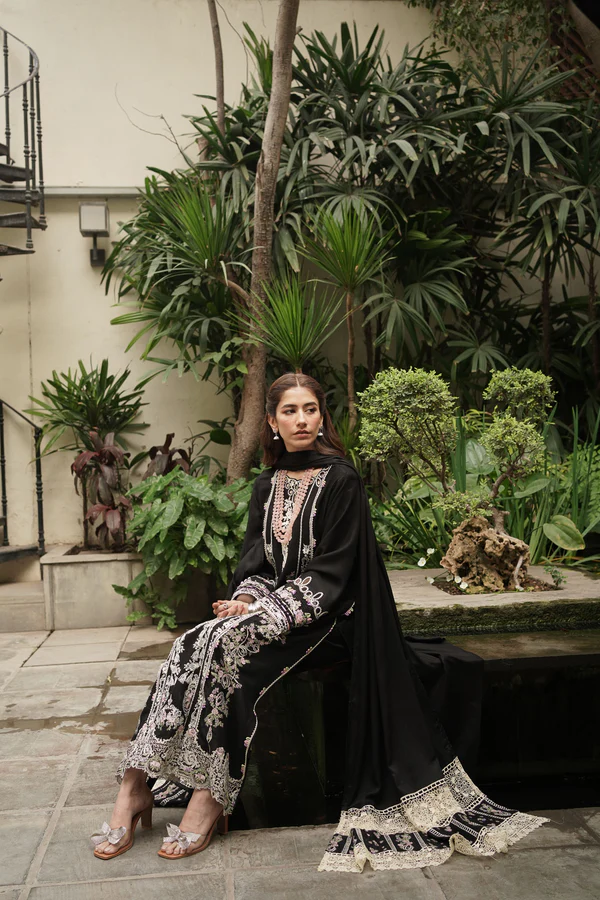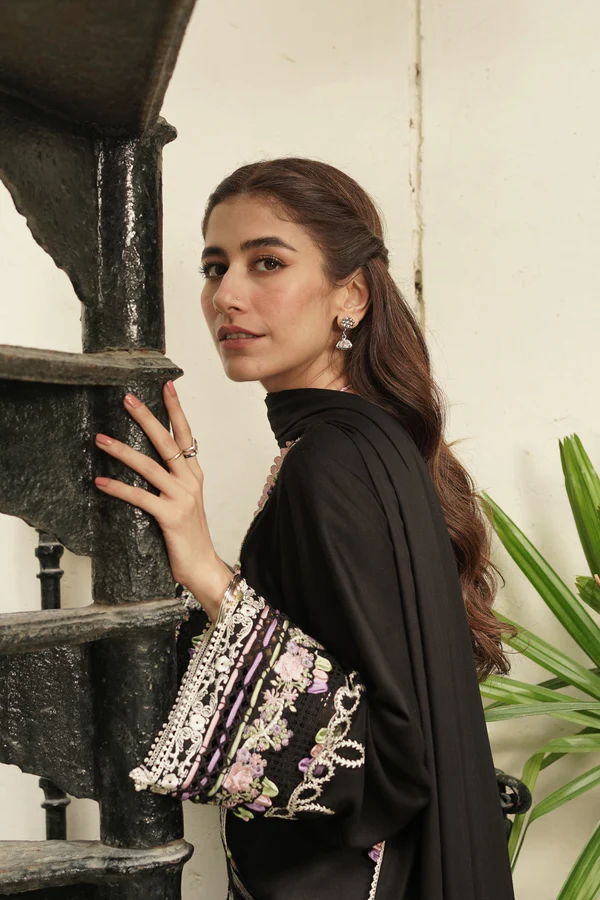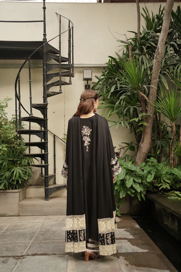 Nujood is a threshold to elegance, showcasing a twill linen shirt with embroideries, an organza patch, and a cutwork neckline on a black canvas. An embellished herringbone shawl adorned with cutwork lace borders over both pallus completes the look. The crochet effect lace is our favorite feature of the outfit.