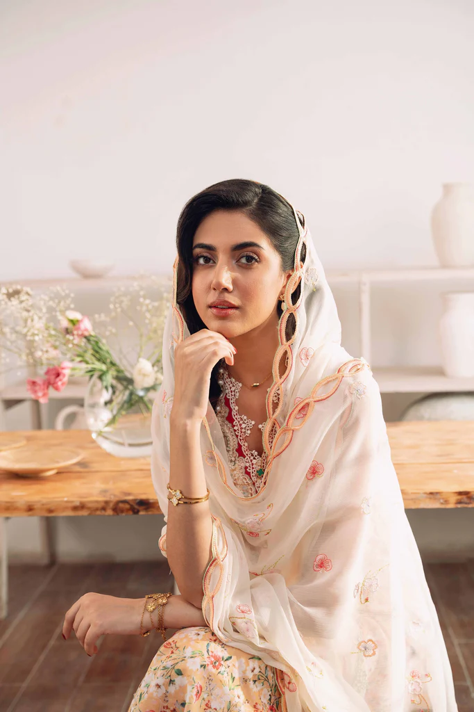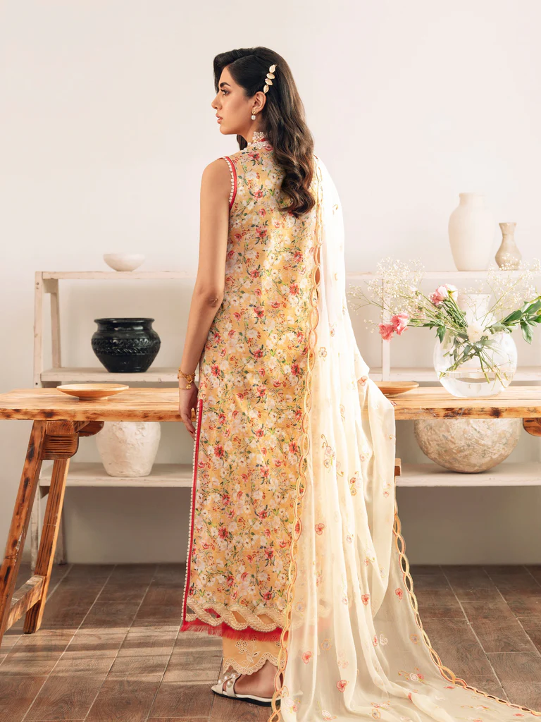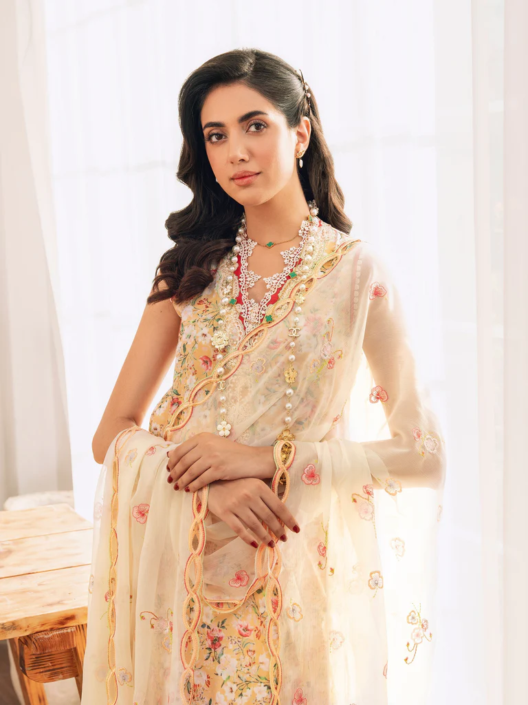 | Fabric: SAL-06-23-V1 | 3 PIECE Flora THIS SUIT HAS THE FOLLOWING ITEMS FRONT * Digital Printed Front on Lawn Fabric | H-50” 01 * Neckline Embroidery on Organza 01 * Front Daman Embroidery Border 30” on Organza 01 BACK * Digital Printed Back on Lawn Fabric | H-50” 01 * Back Daman Embroidery Border 30” on Organza 01 SLEEVES * Digital Printed Sleeves on Lawn Fabric | H-26” 01 * Sleeves Embroidery Motif on Organza | 02 Left & Right 01 TROUSER * Dyed Cambric Schiffli Embroidered Trouser | 2.5M 01 DUPATTA * Embroidered Chiffon Dupatta | 2.5M 01 |