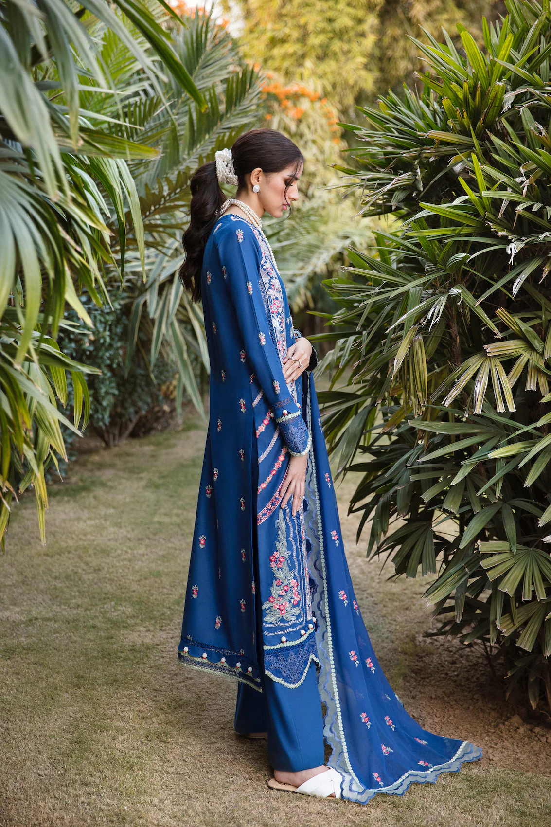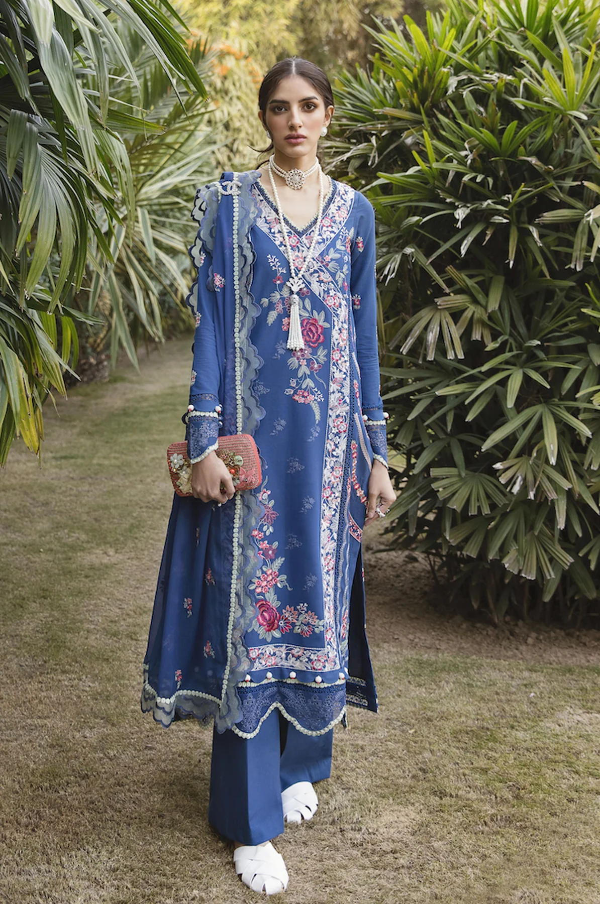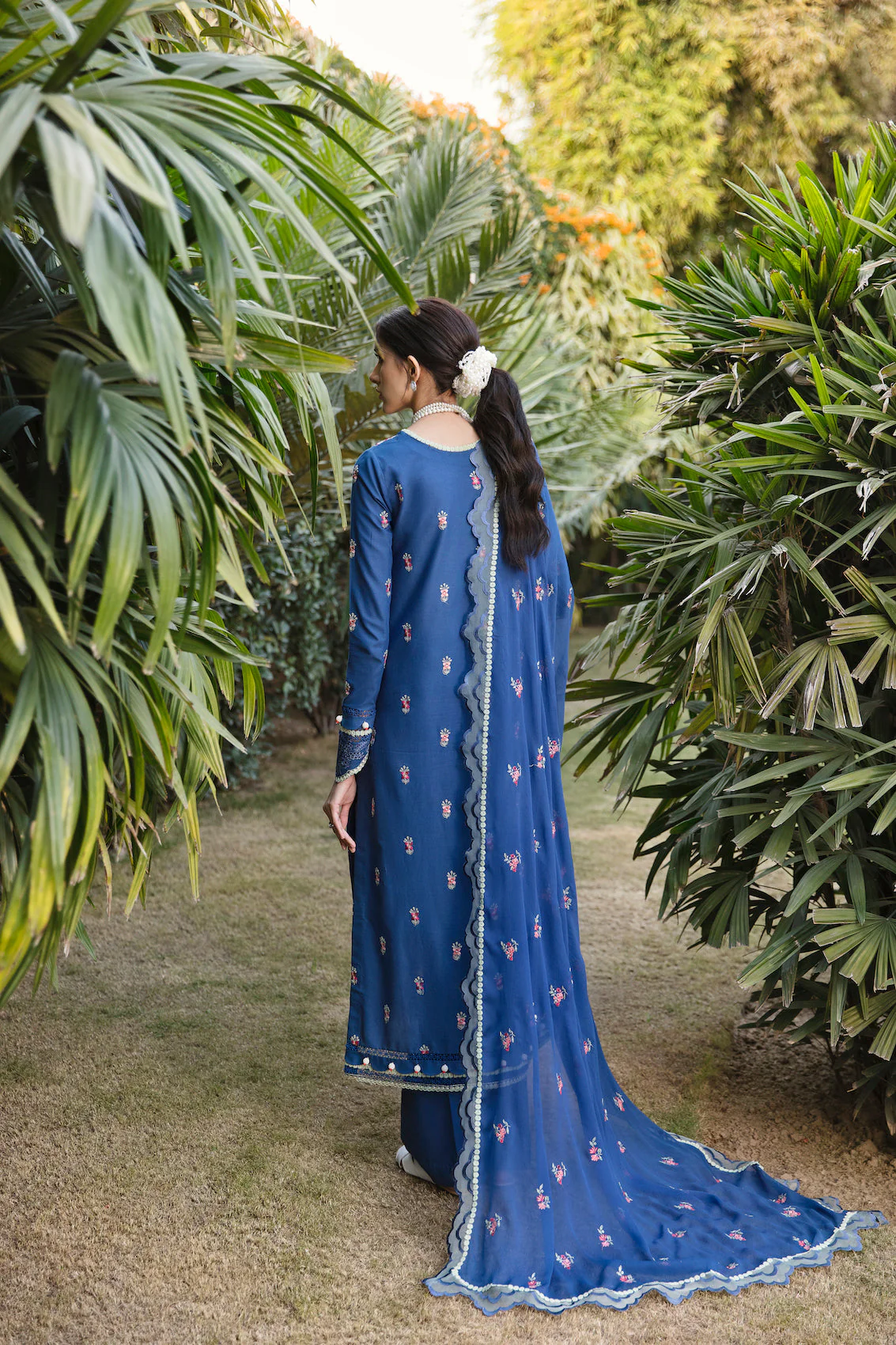 This 3 piece fully embroidered suit is designed on a bluing canvas of lawn fabric inspired by the magnificent “Garden of Eden”; an alluring paradise telling its tale through parsa gari exquisite and intricate embroidery using satin, crewel and stem stitches, paired with eyelet embroidered hem border and sleeve patches. Dupatta is all over embroidered on a same blue chiffon base with 4 side scallop embroidered border on verdigris organza styled with dyed matching blue cambric trouser.