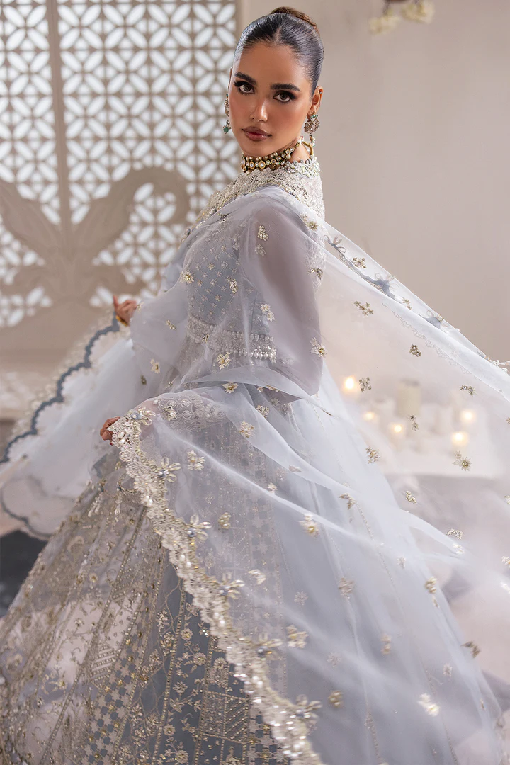 Exquisitely crafted, 'Sofina' emerges as a breathtaking masterpiece, a true embodiment of luxury. Draped in enchanting powder blue, this creation showcases meticulous ivory embroidery that accentuates every exquisite detail. The ethereal sheer fabric cascades gracefully, epitomizing timeless femininity, while the cinched waist elegantly defines the silhouette. This opulent ensemble is completed with a lavishly embellished organza dupatta and a subtly peeking lehenga, seamlessly elevating it to classic status. With its refined elegance and sophisticated allure, 'Sofina' captures the essence of luxurious artistry, enchanting all who behold it.